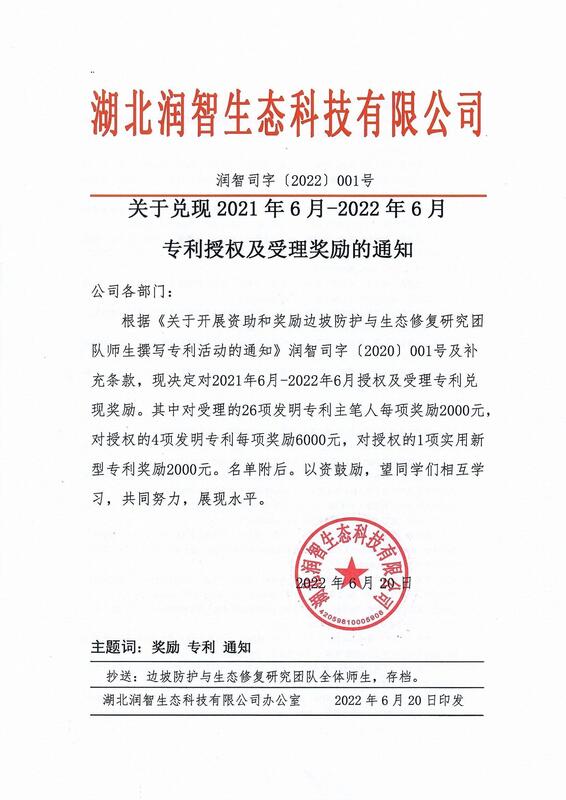 湖北潤智生態科技有限公司關于兌現2021年6月—2022年6月專利授權及受理獎勵的通知(潤智司字〔2022〕001號)